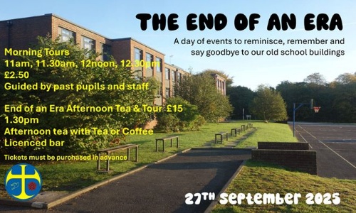Published 22/07/25Our current school buildings will be demolished when we move into our new building so we are organising a day of events to reminisce, remember and say goodbye to our old school buildings. In the morning we are holding guided tours led by past pupils and staff. In the afternoon there will be a celebration afternoon tea and tour. Tickets for both events must be booked in advance via the school shop. Please find further details of both events below.